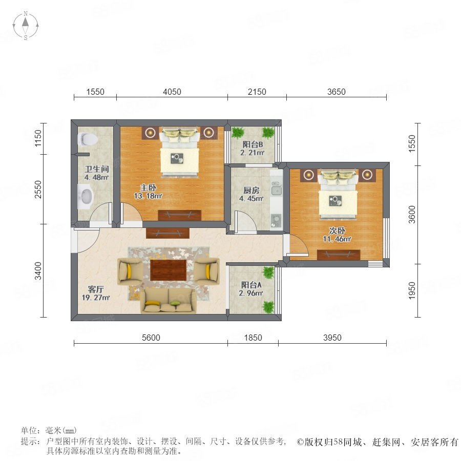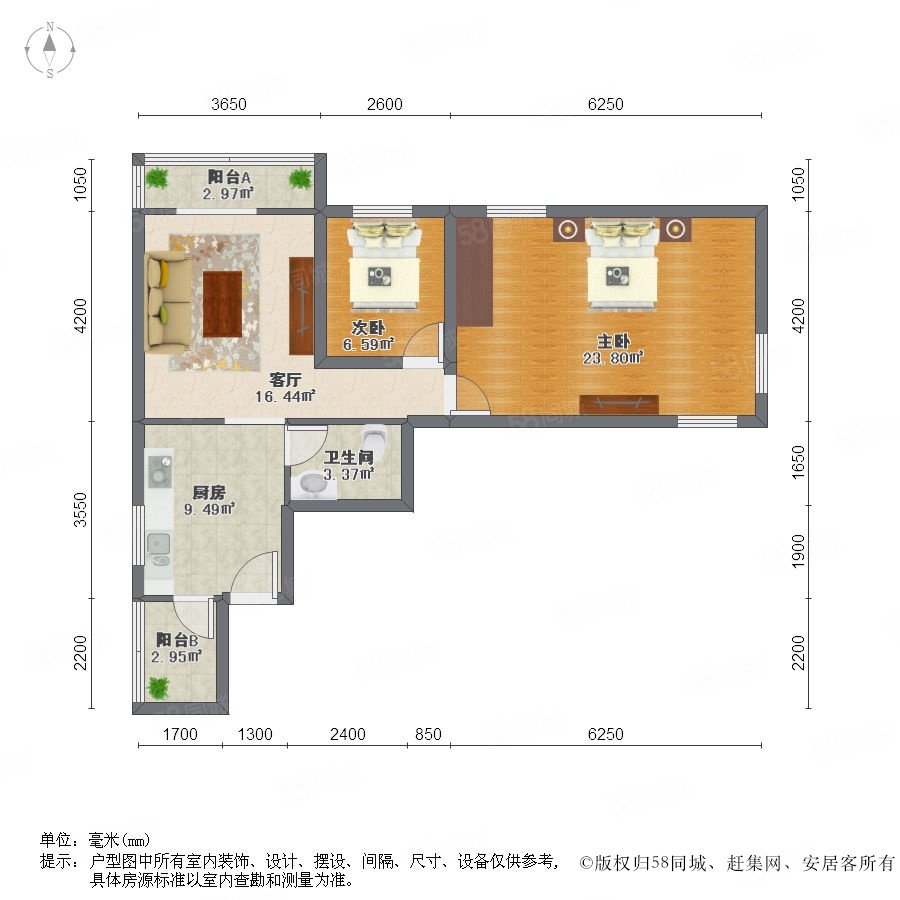2室1廳1衛(wèi) 65m2